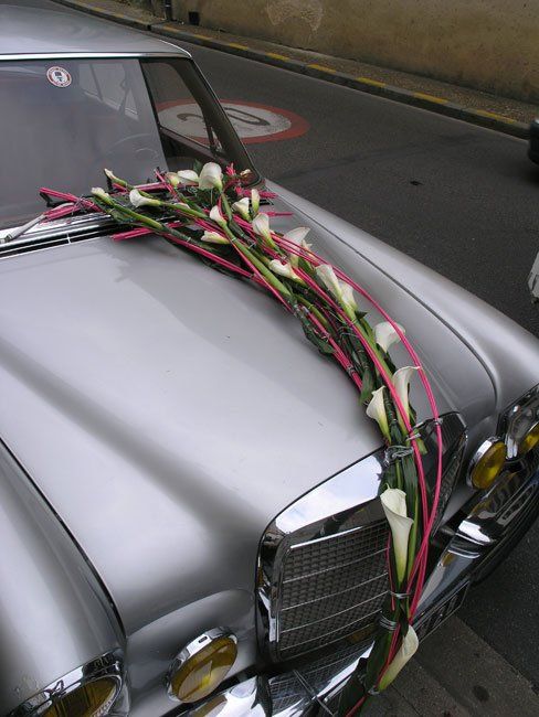 Pour les véhicules à moteur plus rapide, nous pouvons fixer un bouquet ou une composition exotique sur le capot. Enfin, nous pouvons accrocher des fleurs et rubans aux rétroviseurs et partout ailleurs si cela est possible !